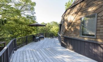 An unusual hexagon shaped dome cottage situated on the top of the hill reached by long private driveway through the woods; 2.1 acre , lush garden, koi pond with a cascade; brand new renovation.