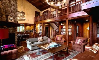 GREAT ROOM With vaulted ceilings, picture windows overlooking the lake and mountains, a majestic fieldstone fireplace, and large dining table, the open floor plan is ideal for large family holidays and group gatherings.