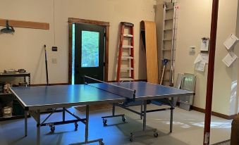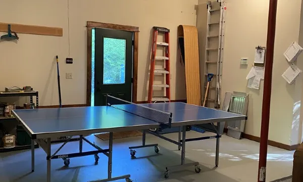 GARAGE REC ROOM Converted to recreation room with ping pong table, foosball table, extra-long couch, table, and chairs.