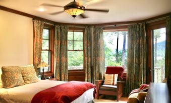 LAKE VIEW UL KING SUITE has bedside tables, large chest of drawers, large closet, and chairs. This second-floor room has many windows looking out over the lake. Private full bathroom.