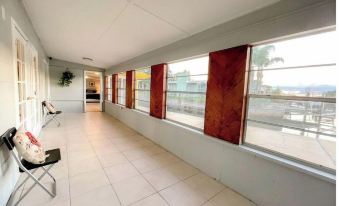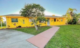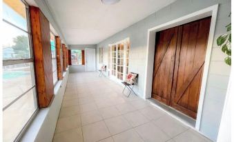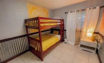 Our spacious master bedroom has a split AC so you can cool the room to your desired temperature. This room features two large bean bag chairs as well as a LG 55 Inch 4K TV and a private attached bathroom. The yellow room includes a bunk bed with 2 twin mattresses and a night stand. This warm and cozy room is great for kids. The teal shark room has a queen bed and an office desk perfect for those who have work while on vacation . It also has a Pioneer 43 Inch amazon smart 4K TV. The living room has a comfy couch and LG 55 Inch 4K TV with a view out to the back yard. This house comes with a 6 seater dining table perfect to enjoy breakfast with ample natural sunlight through our large windows. The kitchen comes equipped with pots, pans, a toaster, a blender, and even a bartender kit for you to put your drink making skills to the test. Lastly, the sunroom/ hallway is a memorable place in our house. The full length of the wall is filled with large panel sized windows that illuminate the whole house.