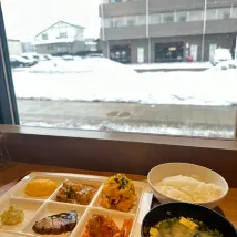 This is a very nice hotel, visible from the station. Although it's close by, it's actually right next door. The service was excellent, and the onsen, while small, was very clean. Breakfast, included in the price, was very good and promptly replenished. Sakura Higashine is a beautiful, cozy little town. I highly recommend a visit. There's a direct Yamagata Shinkansen from Tokyo to Sakura Higashine, but it runs every two hours. The Shinkansen to Yamagata Station runs every hour, and then the slower train takes about 40 minutes.