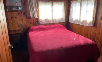 These charming cottages, crafted from cedar log quarters, exude a warm, rustic country charm. Features include a screened porch, skylights, a ceiling fan, and a wood-burning stove to cozy up during cool days and nights, along with a fully equipped kitchen, bathroom, and shower.