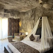 The hotel was predominantly white, and its location was rather remote. The rooms were very wild and primitive, and the private beach was a shallow area that required a long walk to reach for water and wasn't particularly beautiful. The food was also mediocre. In short, unless you're a big fan of cave themes, you might want to consider other options.