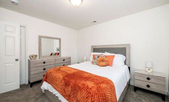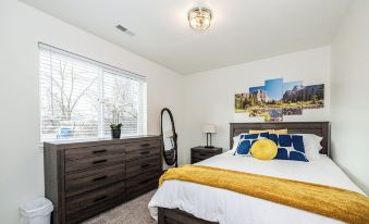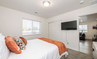 The backyard is accessible from the main living room through a sliding glass door. It's spacious and has plenty of room for yard games or just enjoying the majestic mountain views. There is an outdoor dining set and a propane BBQ grill. Propane refills are available at the Hyrum Chevron station at 35 N 800 E. There is a wood firepit and we include a free bundle of firewood. The backyard includes a rustic cedar privacy fence. Please note there is no gate to keep children in the backyard. However, the street is pretty quiet and has very low traffic. Guests are welcome to eat the apples in the apple orchard on the east side of the house as well as the raspberries on the west side. The raspberries produce a lot of fruit in season which is typically from July to September.