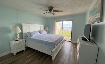Our home offers a soothing master suite with a comfortable king-sized bed, a walk-in closet with organizational shelving, a TV, and a set of sliding doors that open to views of the Intracoastal Waterway. This sleek room also offers a large dresser and two bedside tables to store your belongings. Adjacent to the bedroom is a private bathroom with a bath and shower combination. The master suite allows you to have a great night of rest and relaxation to prepare you for your next wonderful day of vacation!