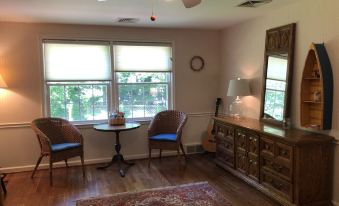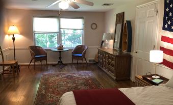 Hardwood floors, large windows, queen beds, table / chairs or desk and chair -work space, ( small kitchenette upstairs with fridge, Keurig, microwave), wireless high speed internet, SmartTVs with Netflix, Hulu, Prime included.