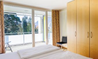About a 10–15 minute walk from Interlaken Ost. The view in front of the hotel is beautiful, and the staff are friendly. The room was decent, with one bathroom and one separate toilet. It also had a fully equipped kitchen, which was great for cooking. However, the room had a noticeable smell, which was a bit unpleasant.