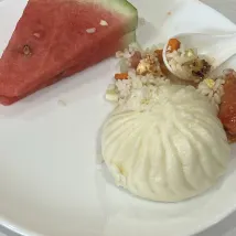 The breakfast was delicious. The fried rice, tomato and egg stir-fry, and watermelon were satisfying.