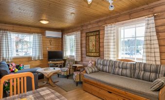 Wooden cottage, built in 1999, kitchen, living room with foldable sofa bed, bedroom with 2 beds, second bedroom with bunk bed, dressing room with foldable sofa bed, 4 showers in the washroom, sauna (wood stove), separate toilet. Covered porch.