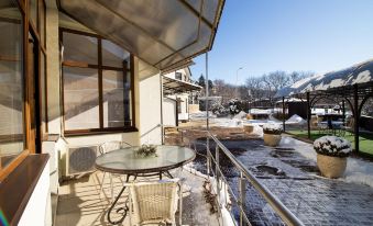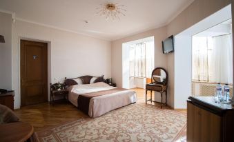 Нашей компании из 5 взрослых и 2 детей предложили двухэтажный номер (301), потом к нам присоединились еще 2 взрослых и 1 ребенок, которые расположились в 204 номере. Наш отдых длился три дня. Первое, что хочется отметить, это доброжелательный и приветливый персонал: на ресепшене милые девочки и молодой человек, которые моментально откликались на все наши просьбы и вопросы, наша восхитительная Катерина, которая кормила нас вкусными завтраками. В последний наш вечер перед отъездом мы решили ужинать на террасе, и нам предоставили всё необходимое: и стулья, и дополнительный столик, и посуду, а администратор Инна в день отъезда вышла нас провожать до калитки. В номерах чисто, уютно, интересная планировка номера позволила комфортно расположиться всей нашей большой компании и при этом не мешать друг другу отдыхать. Расположение отеля удобное, рядом есть продуктовый магазин, в шаговой доступности. Красивые виды из окон, а в воскресенье утром был слышен звон колоколов. В общем, мы уезжали с положительными эмоциями от отеля, и если будем в Кисловодске, то вопрос с жильем точно для нас решен. Рекомендую всем!