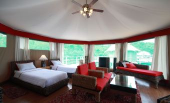 Location & Setting: Remote, serene riverfront setting with lush natural surroundings, ideal for relaxation and immersion in nature. Floating tents or river-facing lodges offer direct river access for swimming, kayaking, and sunset views.