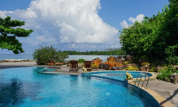 Such a lovely place! We stayed for 4 nights. We booked a 2-bed villa but ended up with a three-bed one, which was amusing – it felt like the bed took up half the villa! The beds and pillows were comfortable. The room was clean, and we didn't notice any insects. Our villa had a nice, comfy porch with cushions, perfect for lounging. You can borrow kayaks for free at the hotel. Throughout the day, complimentary tea, coffee (3-in-1), cocoa, and ice cream are available. The on-site restaurant is pretty good. There are beautiful fish swimming in the sea right by the hotel – at least 15 species – so definitely bring your snorkeling masks. We were really impressed with the hotel managers; they were incredibly accommodating. After checking out and leaving the hotel, we stayed elsewhere on the island but wanted to have dinner at this hotel's restaurant. Even though the hotel was 100% full and they were hosting a New Year's Eve party for their guests that day, the managers still found a way to seat us for dinner.