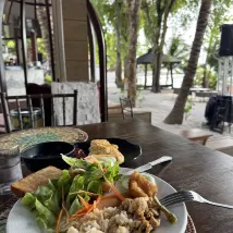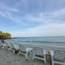 The journey to reach the resort, from the mainland, is a small adventure in itself but well worth it. We only stayed for 3 nights but it was very enjoyable. The small chalet was perfect for a couple and luckily a short walk from the beach, not too far and not too close. Sun loungers and bean bags were plentiful. Breakfast was good and the staff excellent.