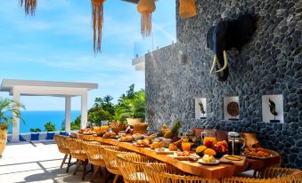 Outdoors, enjoy a private swimming pool and a jaccuzi with a breathtaking Sea View, a large table for 12 people under a covered area with fans and surrounded by tropical trees.