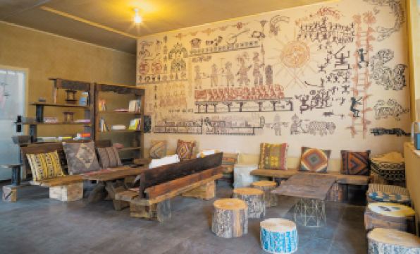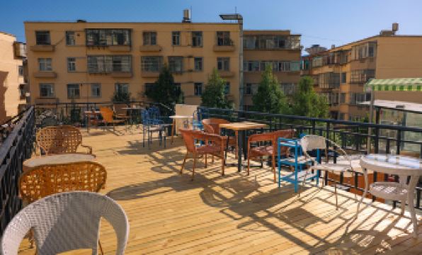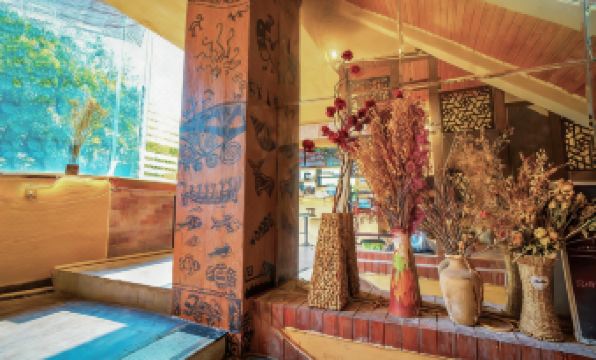 This is my third time staying here, and it's changed a lot since last year. The entire common area is much larger now, and the style is fantastic. The owner mentioned that all the furniture was handmade by him, from lumber he brought back himself – it's really comfortable and impressive. The dogs are a bit fatter than last year, lazily sunbathing, and petting them while sitting nearby is quite therapeutic.