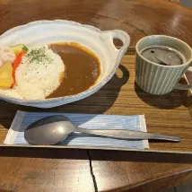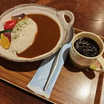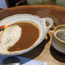 Free breakfast is just a small portion of curry rice with a cup of coffee.