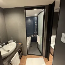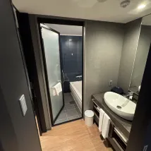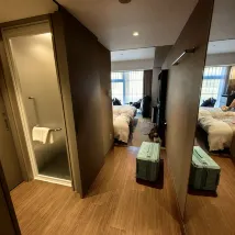 The room size was decent, and the value for money was excellent. It was the most satisfying hotel I stayed at during this trip. Getting around was also very convenient, as it's directly across from the Hachijo Exit of Kyoto Station. The hotel offers sauna and laundry services. The bathroom in the room had a separate wet and dry area, and I could easily open my 24-inch suitcase.