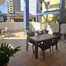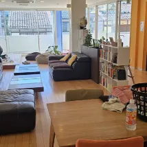 About a 10-minute walk from the Kyoto Station. Great kitchen and leisure space with a huge living room, outdoor patio, and a rooftop terrace.