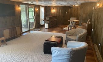 This newly renovated, stylish, cozy, sun-filled modern vacation home has 3 floors 1,898 Sq ft house .58 acres has 3 bedrooms and 2 full bathrooms, fully equipped kitchen, large deck, bbq gas grill, wet bar w/mini fridge, screened in porch, washer/dryer and 2 fireplaces inside. Sleeps up to 6 adults comfortably. Smart front door lock, central AC, free WiFi and firepit. Parking available for up to two cars.