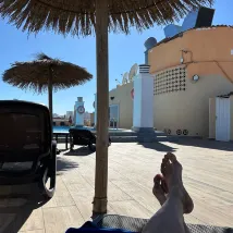 We had a standard room that was clean and with a good shower. The beds are as always in Spain a bit too hard. Use the air condition, because its noisy with the windows open. Our complain is that it is a bit noisy from the corridor as well. The breakfast room is wonderful, with a great view of the ocean. Very good breakfast including everything that you wish for, even a glass of champagne for those who fancy that in the morning! On the top of the hotel they have their swimming pool and good sun chairs, with a fantastic view of the beach and ocean. A good place to rest and enjoy the warm sun.