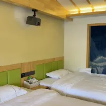 The room boasts an excellent location, situated right below the observation deck. A breakfast restaurant is conveniently located just a short walk up. The entertainment setup is a real highlight: it features a Xiaoming A5 projector that, crucially, comes with Tencent SVIP pre-installed, eliminating the need for screen mirroring.