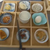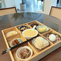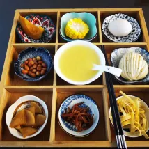 Let's talk about breakfast. A nine-grid plate with a steamed bun, a boiled egg, a cup of soy milk, four plates of pickles, a piece of corn, and a piece of pumpkin. If it's not enough, you can ask for more. This kind of breakfast is not very comfortable to eat.