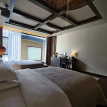 I came for the snow-capped mountains outside the window, and I was stunned by the beauty as soon as I entered the room! It's very close to the North Gate of Shuhe Ancient Town, just a fifteen-minute walk. Compared to staying in the ancient town, this location is quieter and closer to the snowy mountains. The facilities and equipment in the room are all very new, and the decor style is very close to nature. The bedding is also very comfortable, making for a great night's sleep. The service is also very thoughtful; besides welcome fruit, they also provide pear juice and flower cakes every night. Having a rice noodle set meal for breakfast on the sixth floor while enjoying the beautiful scenery is simply delightful.