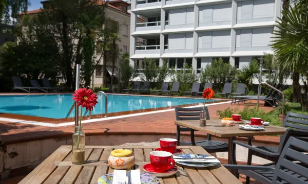 We thoroughly enjoyed our stay here. Arriving by train in Locarno, it was an easy 10 minute walk to the hotel, which sits adjacent to Lake Maggiore. Our room was spacious, with a well-eqipped kitchenette. The whole hotel - including our room, was spotlessly clean, and the staff very friendly. Breakfast was included in the price and was superb - with a selection of breads, croissants (locally made), local jams, meats and cheese. We ate breakfast outside on the terrace each day which was nice. The swimming pool was great - and again, spotlessly clean. The hotel was very conveniently located, and it was an easy walk into the main town, the furnicular railway, the nearby Locarno Lido, and the boats which ply the lake. The Ticinio Ticket (issued to us by the hotel) gave free travel on all public transport in the Ticino area, and also discounts on various attractions. The local bus and train service was efficient and reliable. We'd recommend catching the ferry to Magadino (20 minutes, and free with the Ticino ticket) where there is a lovely (stoney) beach. The trip on the Furnicular (and the church at the top) was well worth a visit. We caught the Centovalli Train to Domodosolla (over the border in Italy), which passes through stunning landscapes. Travel on this train is free with Ticino ticket as fas as the border with Itally. Another trip was on the 321 bus to the village of Sonogno (again, free with the Ticino ticket). We'd highly recommend this hotel if visiting Locarno.