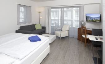 Lovely aparthotel that is central & easy to get to from station. Swimming pool with sunbeds to relax when back from sightseeing. Friendly staff, breakfast was included. It was great to have cooking facilities as Switzerland can be expensive for eating out. Central on lake - balcony was decked out nicely and pizzeria next door did marvelous gluten free take away pizzas so we were happy about this. Recommend this place if you want laid back, central, relaxing and a friendly self catering option.