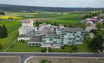 Apartment block "Taborstrasse". On the outskirts, 300 m from the centre. For shared use: indoor pool heated (16 x 10 m, seasonal availability: 15.Sep. - 15.Jun., extra). Table tennis, children's playground. In the house: lift, central heating system. Parking at the house. Supermarket 3 km, restaurant 300 m, bakery 4 km, bicycle rental 16 km, bus stop "Rathaus" 300 m, railway station "Löffingen" 5 km, outdoor swimming pool 500 m. Golf course (18 hole) 20 km. Nearby attractions: Freiburg 45 km. Well-known ski regions can easily be reached: Feldberg 35 km. Well-known lakes can easily be reached: Kirnbergsee 6 km, Titisee 23 km, Schluchsee 39 km. Free family ski lift 800 m. The holiday complex consists of two buildings connected by a corridor. Access to the indoor pool (fee required) only with online reservation. Current opening times on the Internet. During the summer holidays: indoor pool closed, outdoor pool free entry. PLEASE NOTE: The apartments in the apartment buildings can only be rented for tourist purposes. Company bookings only on request (confirmation required). "Schönblick (F 55)", 2-room apartment 54 m2 on 4th floor. Beautiful and cosy furnishings: living/dining room with satellite TV (flat screen), radio, CD-player and DVD. Alcove with curtain with 2 beds (80 cm, length 200 cm). 1 room with 1 double bed (2 x 90 cm, length 200 cm). Kitchenette (4 hot plates, oven, toaster, kettle, microwave, electric coffee machine). Shower/WC. Balcony. Balcony furniture. Beautiful view of the mountains, the countryside and the forest. Facilities: telephone, children's high chair, hair dryer. Internet (WiFi, free). Garage (extra). Please note: non-smokers only. The balcony is glazed. Bookings accepted for holiday purposes only. Instead of an enclosed bedroom, some sleeping areas are located in an open-plan area (gallery, alcove, etc.).