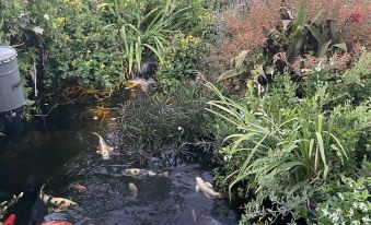 The back deck overhangs the pond full of gorgeous Japanese Koi. Feel free to feed the fish (but only the special koi food in the labeled jar), they’ll eat out of your hands