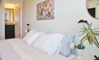 The second and third bedrooms each offer queen beds topped with 100% cotton luxury linen and down pillows. They share a full bathroom with a bathtub and shower head, along with plenty of fluffy towels and quality amenities.