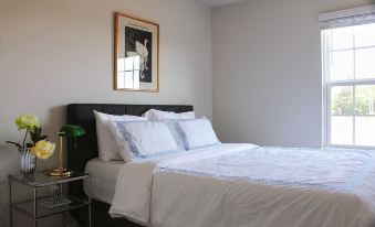 The home has three bedrooms, all upstirs. The master suite features a Crate & Barrel king bed with 100% cotton luxury linen and down pillows for your comfort. A wall mounted TV, dresser, luggage rack are provided in the master suite as well for your convenience. A work desk is setup inside the master suite with a monitor and high speed Wi-Fi for your work needs.