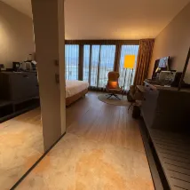 The rooms are spacious, clean, and modern, with comfortable beds, stylish decor, and large windows offering great views of either the lake or mountains. Some rooms have floor-to-ceiling windows, making the scenery even more spectacular. The bathrooms are sleek and well-equipped, and amenities like a Nespresso machine, minibar, and a work desk add extra comfort.