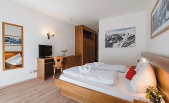 Ho soggiornato 9 notti a metà luglio in questo hotel, apprezzando l'offerta ricevuta via mail, che è risultata soddisfacente per rapporto qualità/prezzo. Stanza ampia, con terrazzo a sud, letto e cuscini comodi, pulizia di ogni ambiente ben eseguita e cambio biancheria da bagno quotidiano anche se non richiesto. Le ragazze alla reception gentili e disponibili, come pure i camerieri Rocco e Giuseppe e il responsabile Benjamin. La colazione era molto varia, tra dolce e salato, con scelta di affettati tra cui molto buoni lo speck e il formaggio. Presenti classici prodotti confezionati come marmellate, burro, miele, Nutella, yogurt, ma anche uova sode, frutta fresca, cereali, pane vario, buone brioche, dolce fatto in casa, macedonia, oltre che succhi e bevande calde a scelta. Ho potuto anche apprezzare la cena, con menù con buffet di verdure vario, sia crude che cotte. Di norma un primo fisso e un secondo, ma con la possibilità di scegliere una alternativa che a volte poteva sostituire il primo o a volte il secondo. Sempre presente il dessert, fatto in casa, vario e goloso. Ho mangiato piatti in generale semplici e buoni, ben cotti, con prodotti di qualità. Le porzioni sono generose. Mi permetto un appunto: un giorno la bistecca alla griglia non era molto tenera, forse un taglio di carne non del tutto adatto, ma di sapore buono: penso più che altro a persone di una certa età. Consiglierei di utilizzare coltelli più taglienti. Al pomeriggio se si è in hotel si possono mangiare dei dolci fatti in casa. Sono inoltre presenti piscina e sauna che personalmente non ho usato visto che ho fatto escursioni lunghe rientrando per la cena. Ci sono anche tavoli da ping pong, calcetto, biliardo in una stanza apposita. Utile la guest card gratuita per i trasporti La valle mi è piaciuta molto, si è circondati da montagne alpine molto alte, su cui rimane traccia dei ghiacciai, che purtroppo sono molto ridotti o scomparsi. Bellissimi alpeggi punteggiati da masi meravigliosi che ricordano la vita contadina di un tempo. Bellissimi boschi di larice e pino cirmolo. Tanti ruscelli, capre e mucche. Non c'è confusione di turisti, molti sentieri di vari livelli di lunghezza e impegno. Vale la pena venire qui in vacanza!!