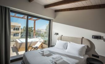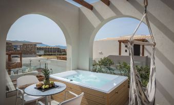 Lovely new hotel and rooms. Liked that the room had it's own small kitchen facilities and fridge. The hot tub was nice, we had 2 separate balconies and our hot tub felt quite private. No pool or breakfast/bar, but with kitchen and local shops not an issue for us. The sea view was distant and just glimpsed between other buildings. It's a really nice relaxing place and quality hotel, it is opposite a 'love' shop, but don't let that put you off. Really close to the beach, shops and a great restaurant. Really easy to get the bus into Heraklion too which took about 20 mins.