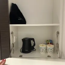 The rooms are designed in a compact useful space saving way. Coffee and tea are kept behind a cupboard that opens to a table.
