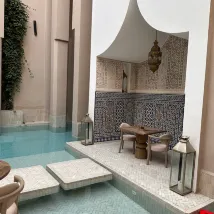 A beautiful traditional Riad, stunningly furnished and so calm and quiet. Maybe 5 minutes walk from the souk and 10 minutes from the main square so really well located to enjoy the sights, sounds and smells of the amazing city of Marrakech. We were given the Manar room which has its own rooftop terrace which was perfect for early morning views and early evening relaxation. The room was spacious and very comfortable. Above all it was very quiet and peaceful. Breakfast was delightful and with good choice although we were surprised that certain coffees and teas were extra cost. We would also prefer to have tea making facilities in the room. We came back daily to the rooftop pool area for early afternoon and the pool is small and not very deep - to be expected really. The parasols are probably more fashion than function and we never were able to get a sun bed as these were generally taken (not sure if day visitors to the Hamam could use them) so we used the beanbags/loungers provided. The staff are lovely and service overall was courteous, professional and friendly. It is not easy to find so we were met by a staff member at a taxi drop off point and similarly taken to our departure point when we left. Overall a lovely oasis and stay in the Medina.