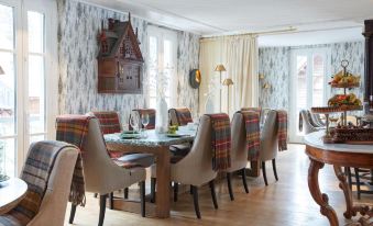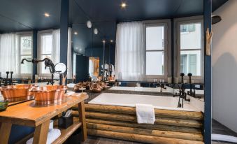 Beautifully decorated in a Alpine style, with much attention to detail. Excellent food, including the famous chocolaterie. Excellent rooms and bathrooms. The only negative is that if you have a room giving to the front, you may be woken up by loud voices - usually young people coming out of nightclubs.