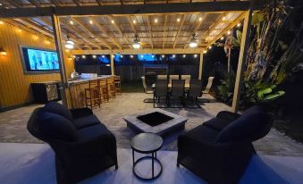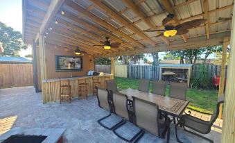 Pura Vida! The home is centrally located in Merritt island minutes from Cocoa beach. The backyard offers many amenities including a heated pool, outdoor bathroom with toilet, sink and shower, fire pit, outdoor kitchen with pizza oven and bar area with a 65" smart tv. The first and second bedrooms have double open doors that lead out to the patio by the pool. This is a great place for family vacation!About pets:No pets allowed.About checkOut:Check out before 11:00 AM.About children:Children allowed: ages 0-17.About checkIn:Check in after 4:00 PM.About smoking:Smoking is not permitted.About minBookingAge:Minimum age to rent: 21.About events:No events allowed.