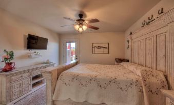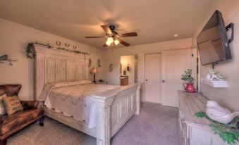 Pamper guests with extra room and amenities, as each bedroom has its own en-suite bath and flat-screen TV. Retreat to the main level bedroom, offering a queen-size bed, grand headboard, and a door out to the patio for easy access to the hot tub. Its en-suite bath has a shower and single vanity with granite counters. The main floor location and walk-in shower make it a great choice for older guests or those with mobility issues.