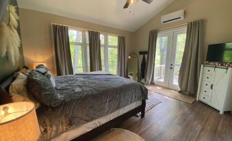 Come enjoy our Solar-Powered Bardominium on the Conasauga River with floor to ceiling windows, great fishing, hiking trails, and wildlife! Sleeps 6-8 with brand new, leather, living room couch, big screen tv and each bedroom with a tv. Indulge in the marble, double-headed master shower and another full bath with tub for soaking if you'd rather. Master bed has a wonderful view of the river and the 30 acre timber farm with its own deck! The second deck is off the kitchen with everything you'll need, including a charcoal grill. Watch the wildlife early morning and at dusk around the farm and on the river. FISH til you drop, with lots of different species in this area, or relax in the hammock or swing on the back porch. There is also a baby gate provided as well as a few toys, games, corn hole, a chalkboard wall and a fire pit great for roasting smores.