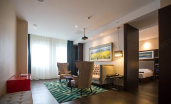 Hotel is quite modern and the interior looks good. Taxis can be ordered directly in front of the hotel. Our room had a huge window from the bathroom to the bedroom which was odd. Staff was great!