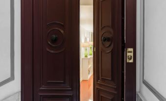 A truly enchanting stay in the heart of the city—this apartment is a hidden gem, nestled within a beautifully adorned building crowned with a striking Stella above the gate. The entire structure, both inside and out, is steeped in charm and artistic character, setting the tone before you even step inside.