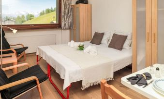Large resort "Rosablanche", 8 storeys, built in 1972. 10 m from the skiing area. For shared use: lawn for sunbathing, pond. Tennis (01.Jul. - 15.Sep.), basketball, children's playground. In the complex: restaurant, lift, storage room for skis, central heating system, washing machine (extra), tumble dryer (for shared use, extra). Motor access to the house. Parking (limited number of spaces) at the house, public parking 100 m extra. Shop 10 m, bus stop "Haute-Nendaz, station/poste" 7.7 km, railway station "Sion" 20.5 km. Golf course (18 hole) 25 km, tennis 7 km, skisport facilities 10 m, ski bus stop 100 m, ski school, children's ski school 10 m, ski-kindergarten 7 km, sled run 100 m, ice rink 7 km, children's playground 10 m. Well-known ski regions can easily be reached: 4 Vallées 10 m. Hiking paths: Barrage de Cleuson 5 km, Bisse de Chervé 5 km, Bisse de Saxon 200 m. Please note: Additional accommodations can be booked. Sports shop / ski rental. Heating in winter only. A cash deposit is requested for the key of the parking gate and the parking card (CHF 200.- or EUR 200.-). If you are leaving early morning, you may collect your deposit the evening before departure and will have to pay the parking for the last night. "Rosablanche D35", 1-room apartment 18 m2 on 3rd floor, north facing position. Simple furnishings: living/dining room with 1 pull-out bed (2 pers.), cable TV. Kitchenette (2 hot plates, kettle, electric coffee machine). Shower/WC. View of the mountains. Please note: non-smoking house. Maximum 1 pet/ dog allowed. Lift D.