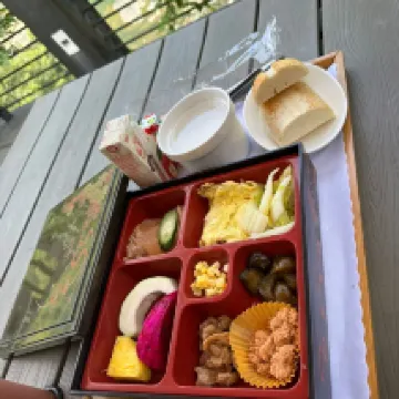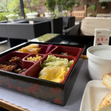 Breakfast was served in a style resembling a Japanese bento box, accompanied by congee, bread, Yakult, and a paper cup of apple juice. I enjoyed it thoroughly on the pleasant river-facing terrace.