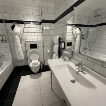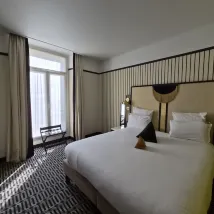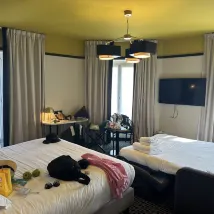 The room was excellent and very spacious for our family of four; it even seemed like we had one of the largest available. We were fortunate enough to stumble upon a triathlon competition and even got to watch some of it, which was a pleasant surprise. The hotel is conveniently located, just a 700-meter walk from Ville train station. Inside the room, we appreciated the complimentary welcome drinks, snacks, iced water, and tote bags—a thoughtful touch. The slippers provided were also very comfortable. The only minor point was that the elevator was a bit small, but it felt very sturdy, and it was great not having to climb stairs. The service was outstanding—very polite and attentive.