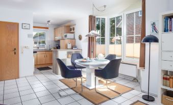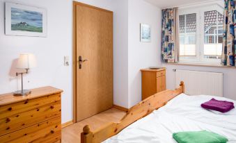 Semi-detached house "Richtpfad". In the resort, 1 km from the centre, 4 km from the sea, 5 km from the beach, located by a road. In the house: central heating system. Parking at the house. Shop 150 m, restaurant 1 km, bakery 150 m, café 1 km, bus stop "Norden Mittelmarkt" 1 km, railway station "Norden" 2.5 km, sandy beach 5 km, outdoor swimming pool 11 km, indoor swimming pool 1.5 km. Golf course (18 hole) 5.5 km. 3-room semi-detached house 85 m2 on 2 levels, on the ground floor. Beautiful and tasteful furnishings: living/dining room 32 m2 with satellite TV (flat screen), CD-player. Exit to the terrace. Kitchenette (oven, dishwasher, 4 ceramic glass hob hotplates, toaster, kettle, microwave, electric coffee machine). Sep. WC. Upper floor: 1 room 15 m2 with 1 double bed (2 x 100 cm, length 200 cm). 1 room 15 m2 with 2 beds (90 cm, length 200 cm), satellite TV (flat screen). Shower/WC. Terrace furniture, deck chairs (2). Facilities: telephone, iron, children's high chair. Internet (WiFi, free). Please note: non-smoking house. Smoke alarm. Beach chair on the terrace. Bringing a small child as a 5th person is not permitted.