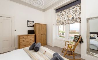 Right of the hallway awaits a warm, Victorian period sitting room with fire and large bay window offering Firth of Forth sea views - Beautifully furnished & has three settees & large TV. A stunning crystal chandelier hangs from the original ceiling rose. The typical Scottish furnished room is completed with its Fraser Tartan wool blinds.